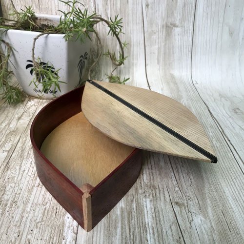 The Hideki is a classic box in highly figured Teak, made with a twist on the regular box joint. The detailing on the joint is made with three layers of ultra thin veneer to create a unique design element that stands out, especially when viewed from the side. The lid has carved ends, inspired by Japanese temple roof design. The hinge is an antique, over 100 years old, salvaged from an antique box.